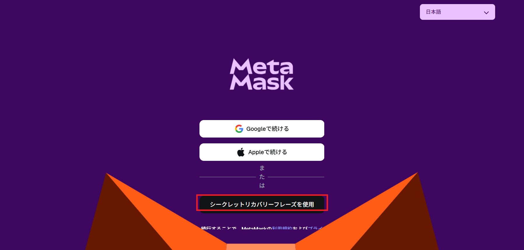 「リカバリーフレーズを使用」ボタンをクリックしてください。