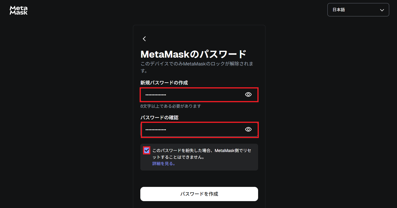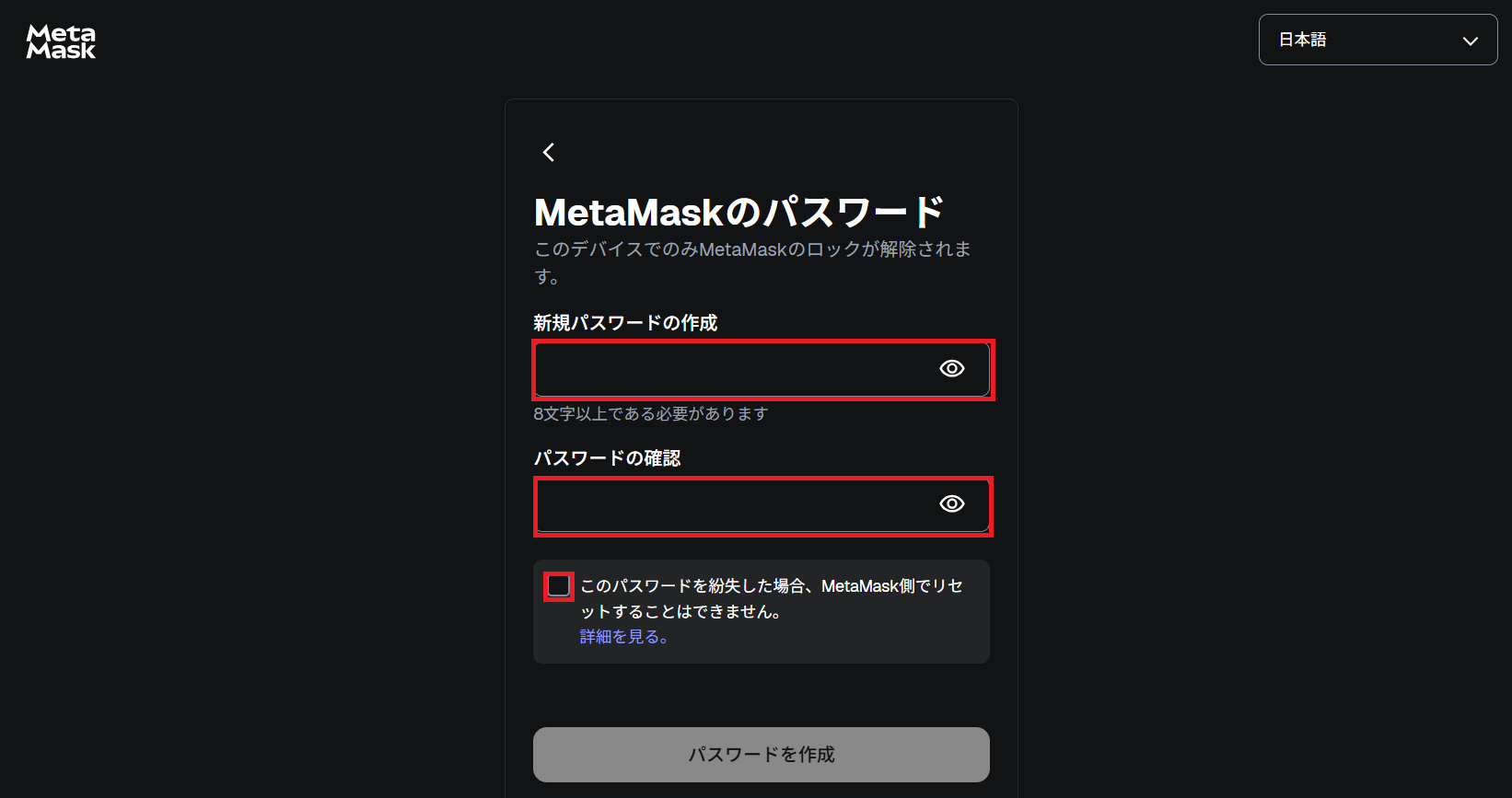 メタマスクを使う際にログインをします。その時に使うパスワードを同じものを2回入力してください。