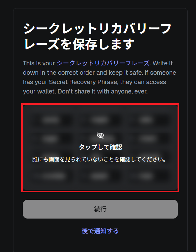 リカバリーフレーズがボヤケタ画面が表示されます。タップして確認をクリックしてください。