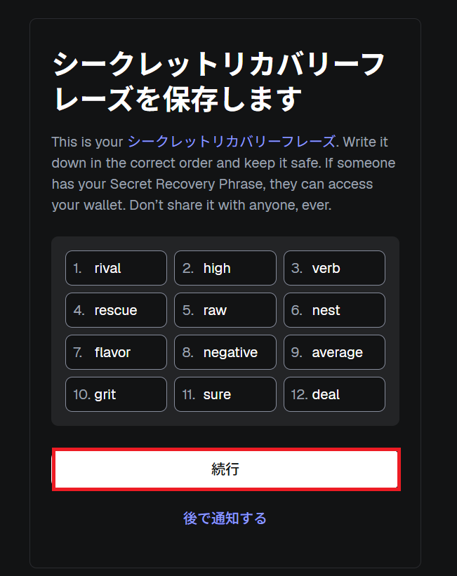 リカバリーフレーズがはっきりと表示されますので画面をキャプチャするか紙に書き留めて保存してください。