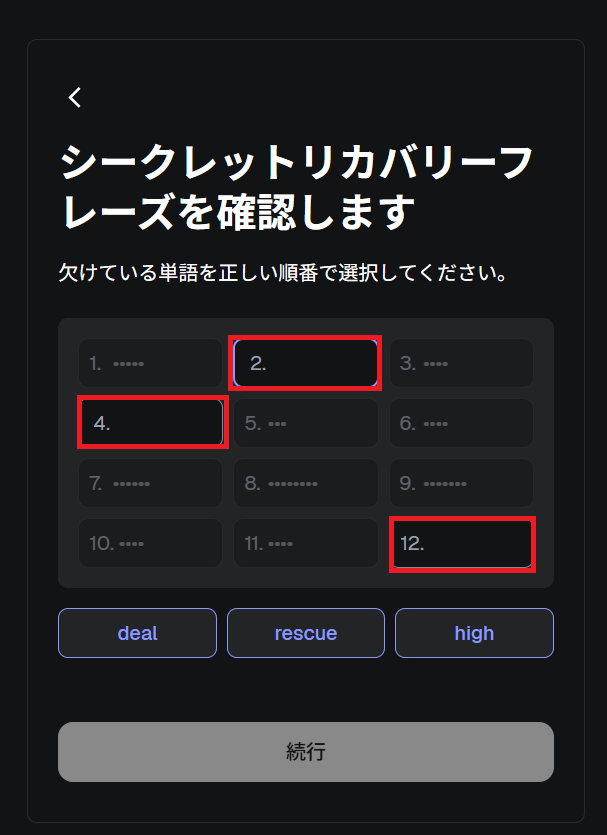 リカバリーフレーズが3か所空白の画面が表示されます。下段の選択肢から選択して空白を埋めてください。