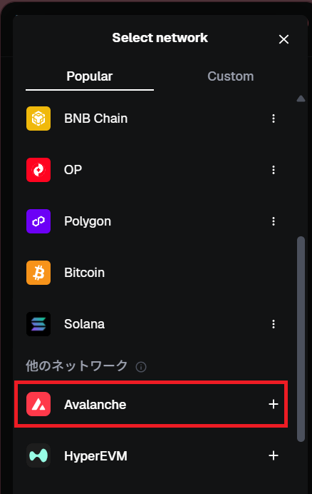 Avalanceの右横の「+」ボタンをクリックしてください。Avaxが常時表示されるようになります。
