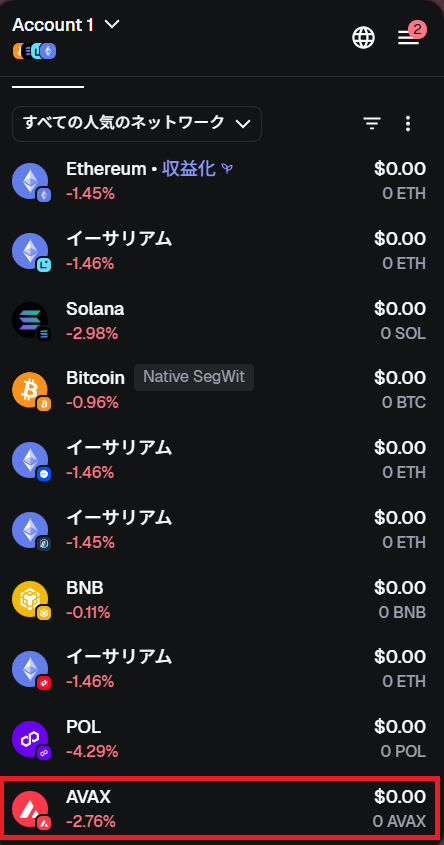 一番下までスクロールして AVAXを見つけてください。