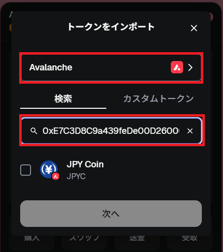 次にJPYCトークンを追加します。長方形の赤枠をクリックしてください。すると