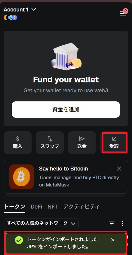 トークンがインポートされました。JPYCをインポートされました、と表示されます。